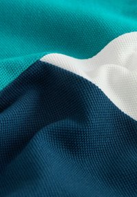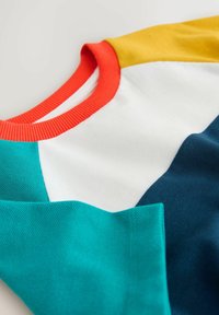 Kurzärmeliges T-Shirt mit Rundhalsausschnitt aus Baumwolle. Farbblöcke in Türkis, Weiß, Marineblau und Gelb mit rotem Halsausschnitt.
