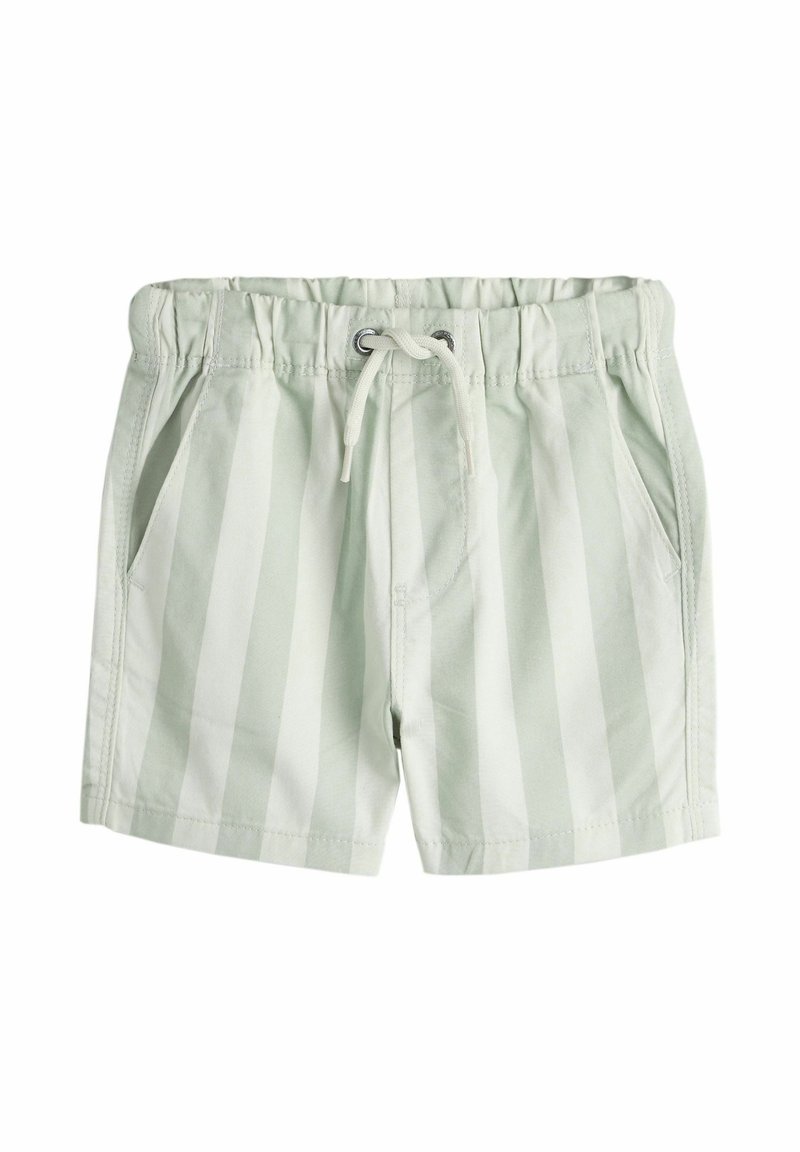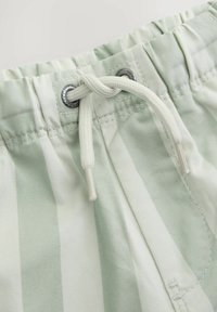 Hellgrüne und weiße Shorts mit vertikalen Streifen, einem elastischen Bund, Kordelzug und seitlichen Taschen.