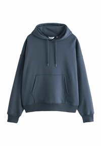 Schwarzer Kapuzenpullover mit lockerer Passform, Kordelzügen, Tasche vorne, gerippten Bündchen und weicher Textur, getragen über schwarzen Hosen.