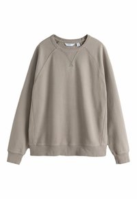 Brauner Baumwollpullover mit Rundhalsausschnitt und gerippten Bündchen, mit struktureller Oberfläche und lockerer Passform. Getragen mit dunkelblauen Jeans.