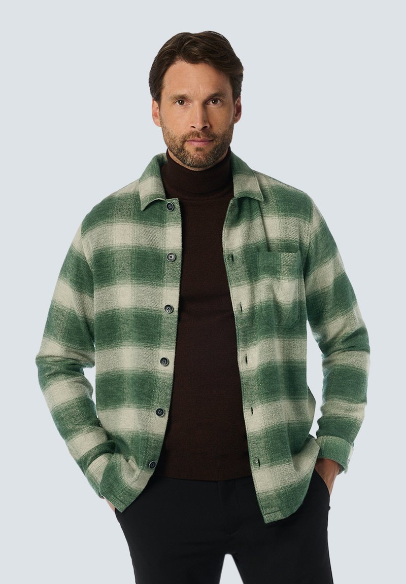 Grün- und cremefarbener karierter Hemd aus Flanell mit Kragen, langen Ärmeln und Brusttasche mit schwarzen Knöpfen.