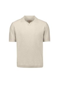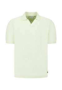 Mann mit kurzen, lockigen Haaren, der ein marineblaues Polohemd mit kurzen Ärmeln und schwarze Hosen trägt und vor einem schlichten hellen Hintergrund steht.