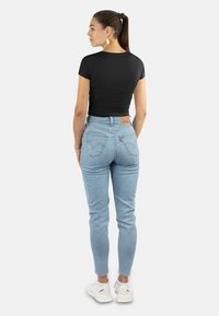 Schwarzes, kurzes T-Shirt mit kurzen Ärmeln, kombiniert mit hellblauen, hoch taillierten Jeans und weißen Sneakern, die einen lässigen Look zeigen.