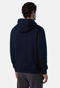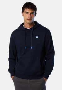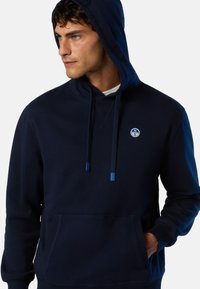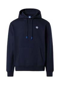 Marineblauer Hoodie mit einer Fronttasche, Kapuze mit Kordelzug und einem kleinen, runden Logo. Hergestellt aus weichem Stoff mit gerippten Bündchen und Saum.