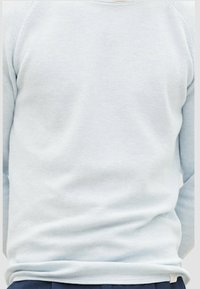 Helles blaues Langarmoberteil aus strukturiertem Stoff mit rundem Halsausschnitt, kombiniert mit dunkelblauen Hosen. Das Modell steht seitlich.