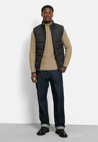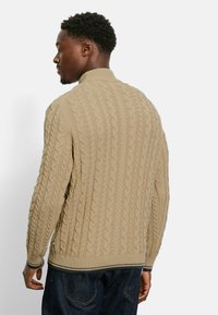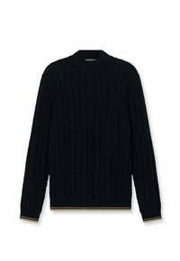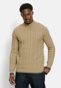 Beige Strickpullover mit hohem Kragen, strukturiertem Muster und kontrastierenden navyblauen Rippbündchen und Saum. Getragen mit dunklen Jeans.