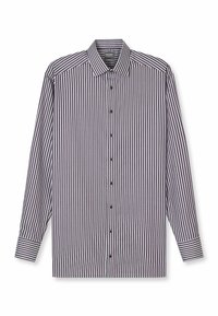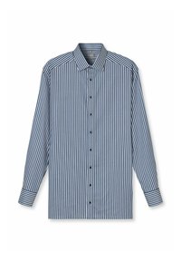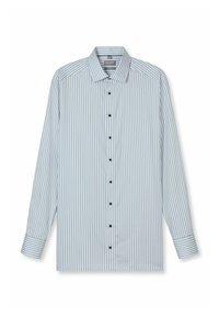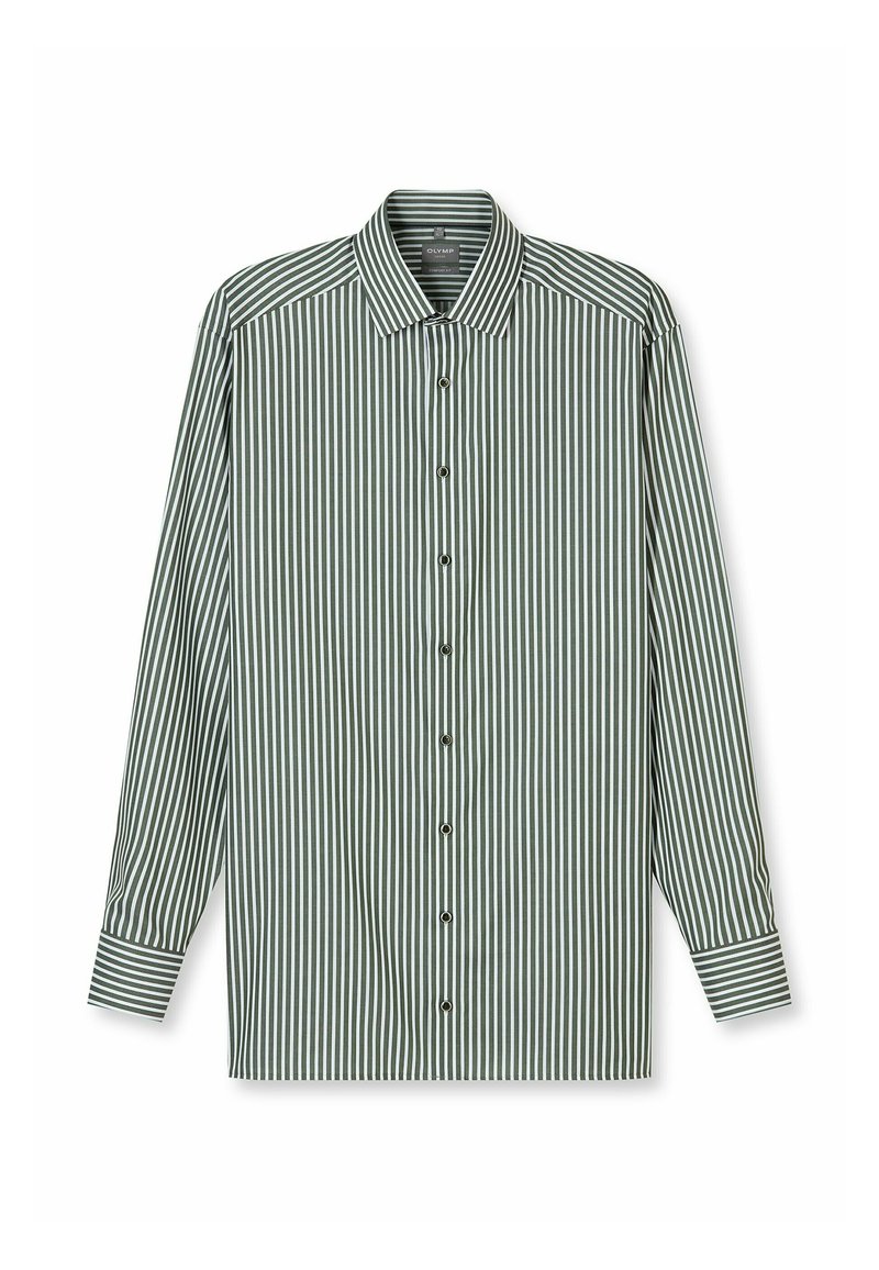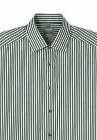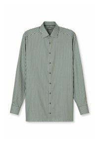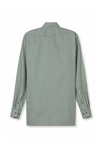 Gestreiftes Langarmshirt in Grün und Weiß mit durchgehender Knopfleiste, klassischem Kragen und geknöpften Manschetten. Weicher Stoff mit glatter Textur.