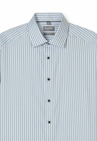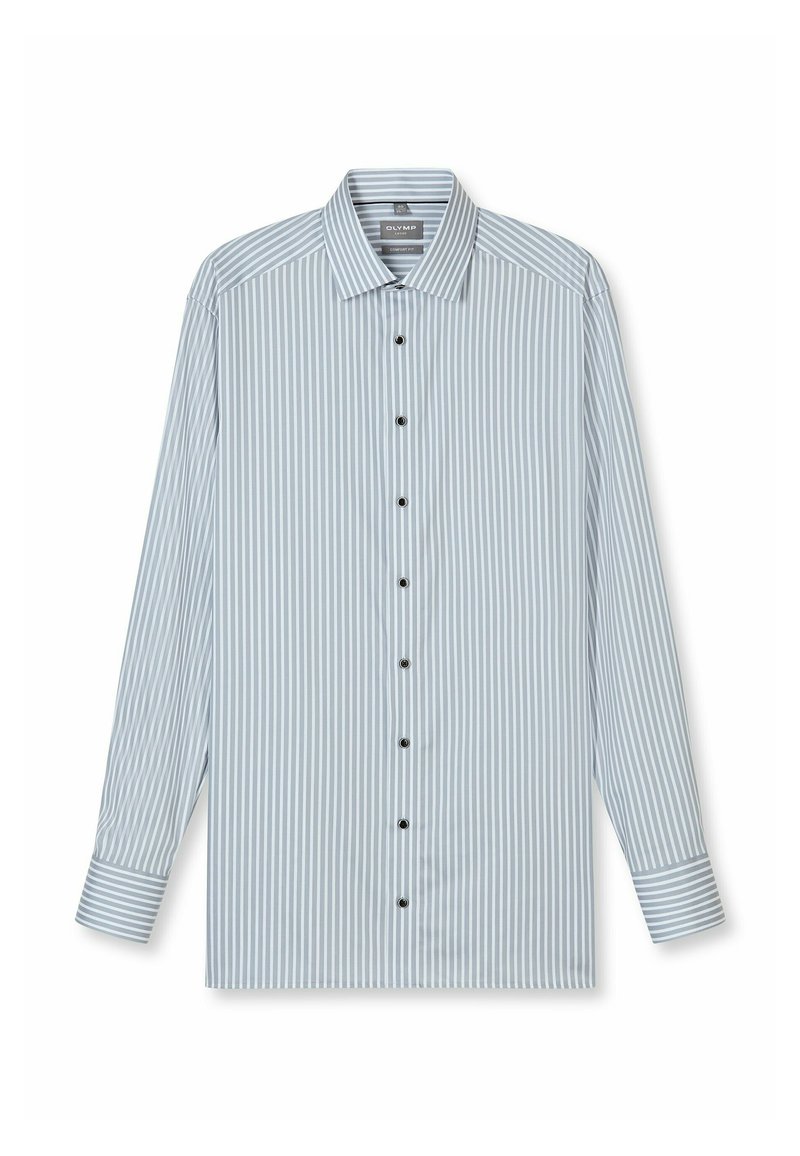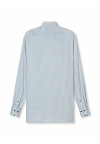 Gestreiftes Langarmhemd in Hellblau und Weiß mit durchgehendem Knopfverschluss und schwarzen Knöpfen sowie kontrastierenden gestreiften Manschetten.