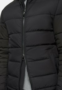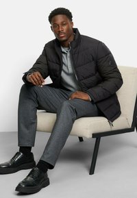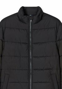 Schwarze Steppjacke mit hohem Kragen, gestepptem Muster und Reißverschluss vorne. Getragen über einem hellgrauen strukturierten Hemd und dunklen Hosen.