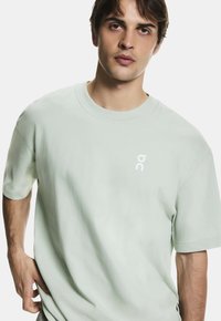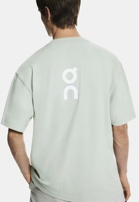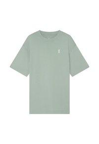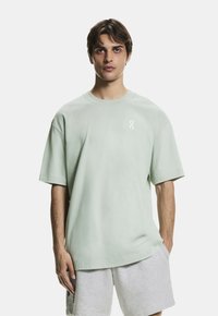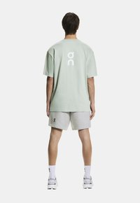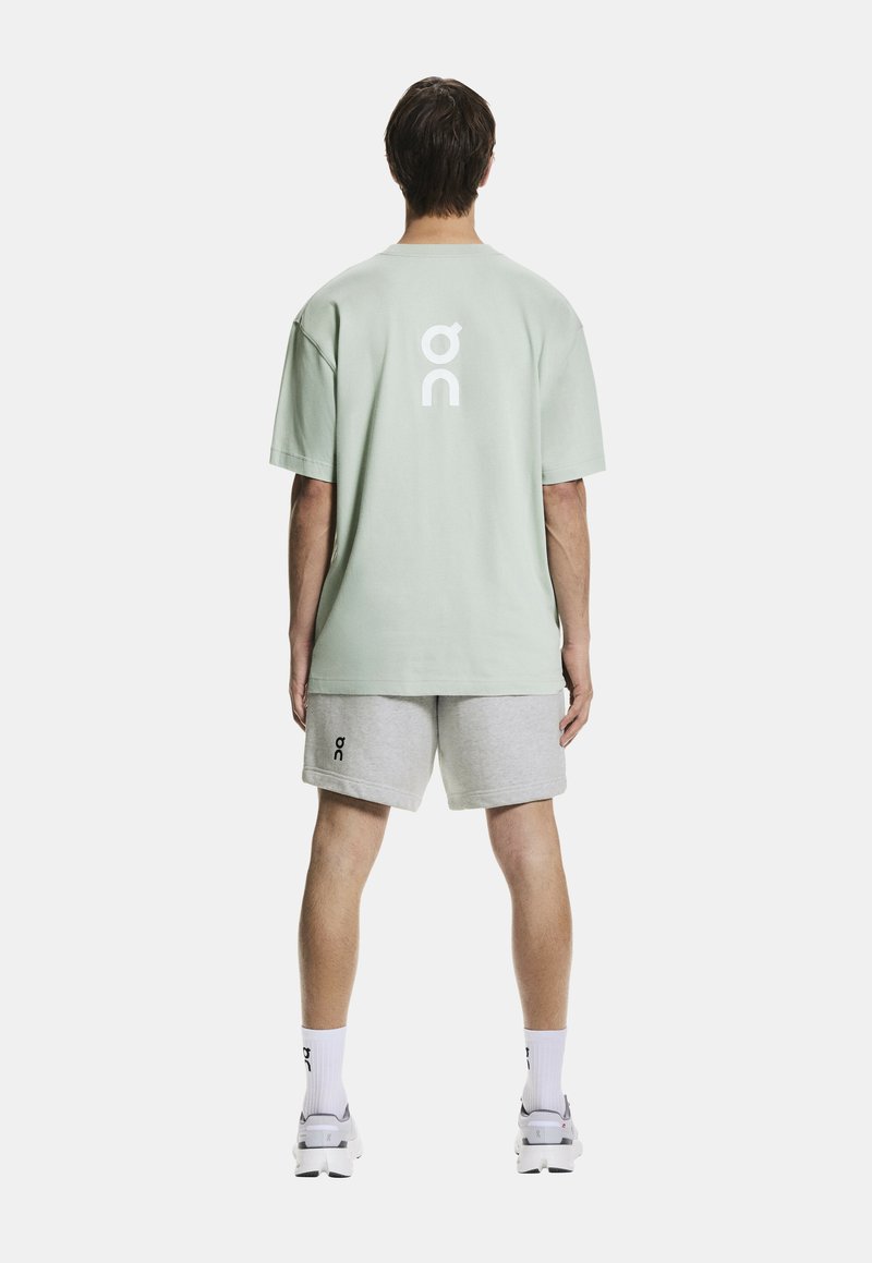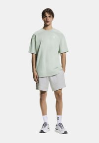 Mann trägt hellgrünes übergroßes T-Shirt und graue Shorts mit Logos, weiße Socken und Sneakers, steht mit dem Rücken zum Betrachter vor einem einfarbigen Hintergrund.