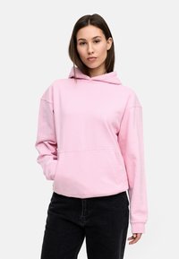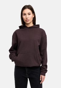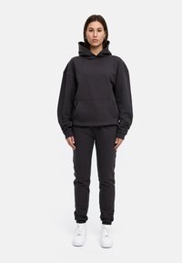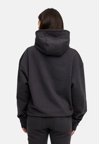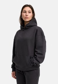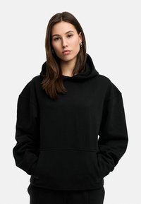 Schwarzes, übergroßes Hoodie aus Baumwollmischung mit einer Fronttasche und verstellbarem Kordelzug an der Kapuze. Glatte Textur, lässige Passform.