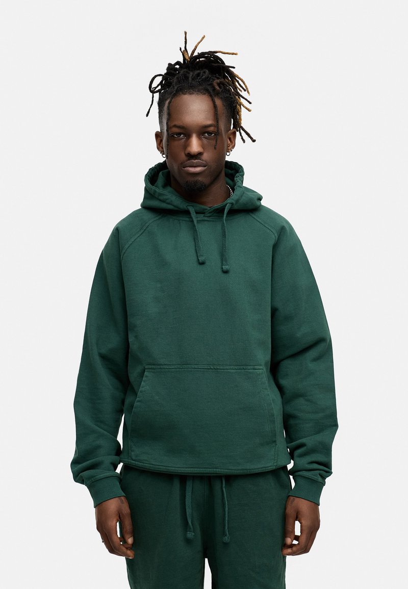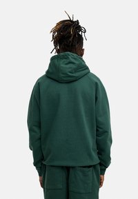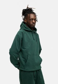 Grüne Kapuzenjacke aus strukturiertem Stoff, mit einer großen Fronttasche, Kordelzug an der Kapuze und gerippten Bündchen. Kombiniert mit passenden Hosen.