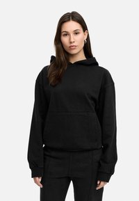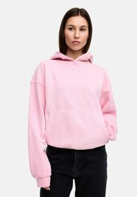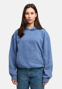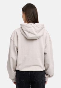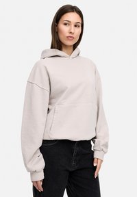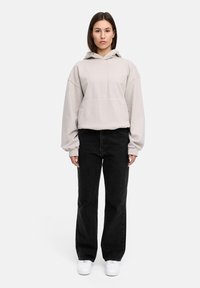 Hellbeige übergroßer Kapuzenpullover mit einer Fronttasche, gerippten Bündchen und einer Kapuze ohne Kordelzug, kombiniert mit dunklen Jeans.
