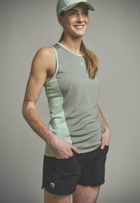 Person mit Vitiligo, die schwarze Sportshorts anpasst, trägt ein ärmelloses hellgrünes Oberteil, gezeigt vom Hals bis zur Mitte des Oberschenkels vor grauem Hintergrund.
