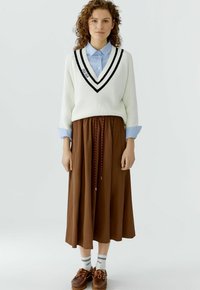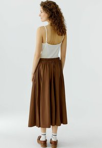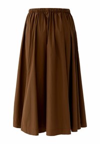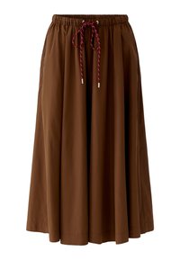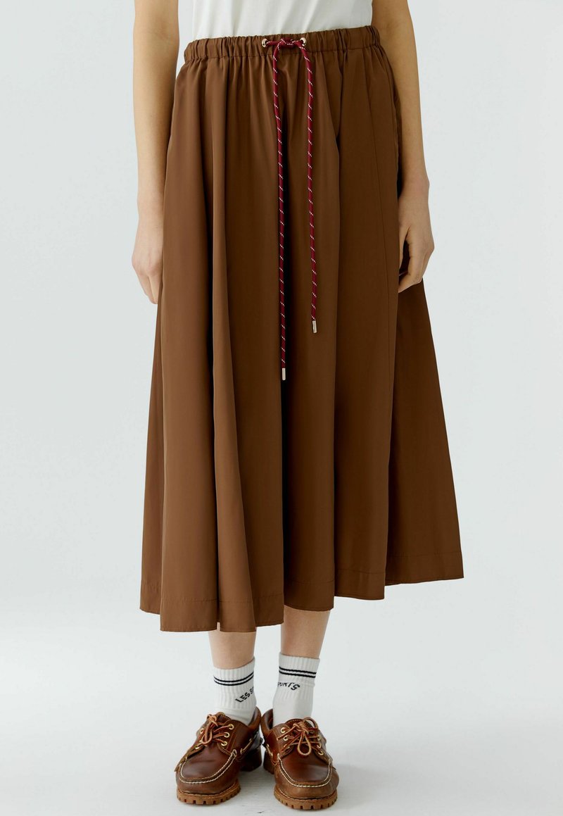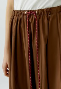 Brauner Midirock mit gesammeltem elastischem Bund und rotem Kordelzug, getragen mit weißen Socken und braunen Schnürschuhen an einer stehenden Person.