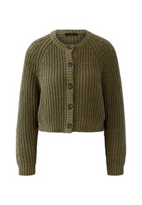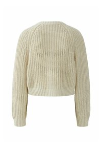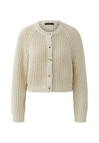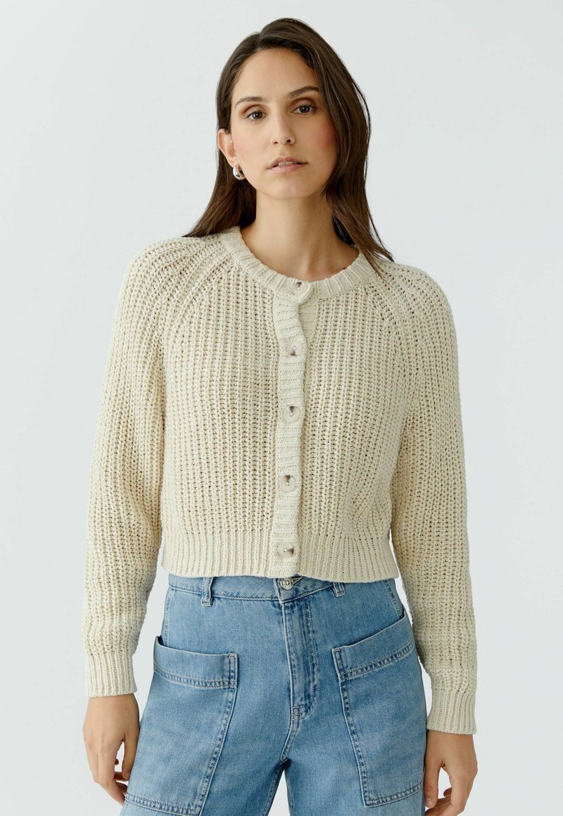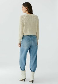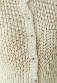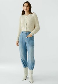 Frau trägt cremefarbene, gestrickte, geknöpfte Strickjacke und hellblaue, hoch taillierte Jeans mit aufgesetzten Taschen vorne, steht vor einem schlichten Hintergrund.