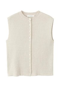 • Beige kurzes Jacket mit zwei vorderen Taschen, kombiniert mit weißen weit geschnittenen Hosen. Der Hintergrund zeigt eine strukturierte graue Backsteinwand.