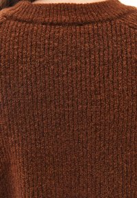 Brauner Strickpullover mit langen Ärmeln, gerippter Struktur und Rundhalsausschnitt, kombiniert mit blauen Jeans und einem braunen Gürtel mit silberner Schnalle.