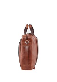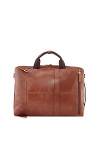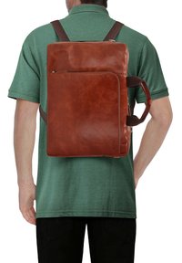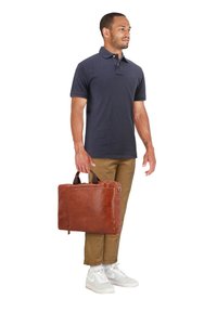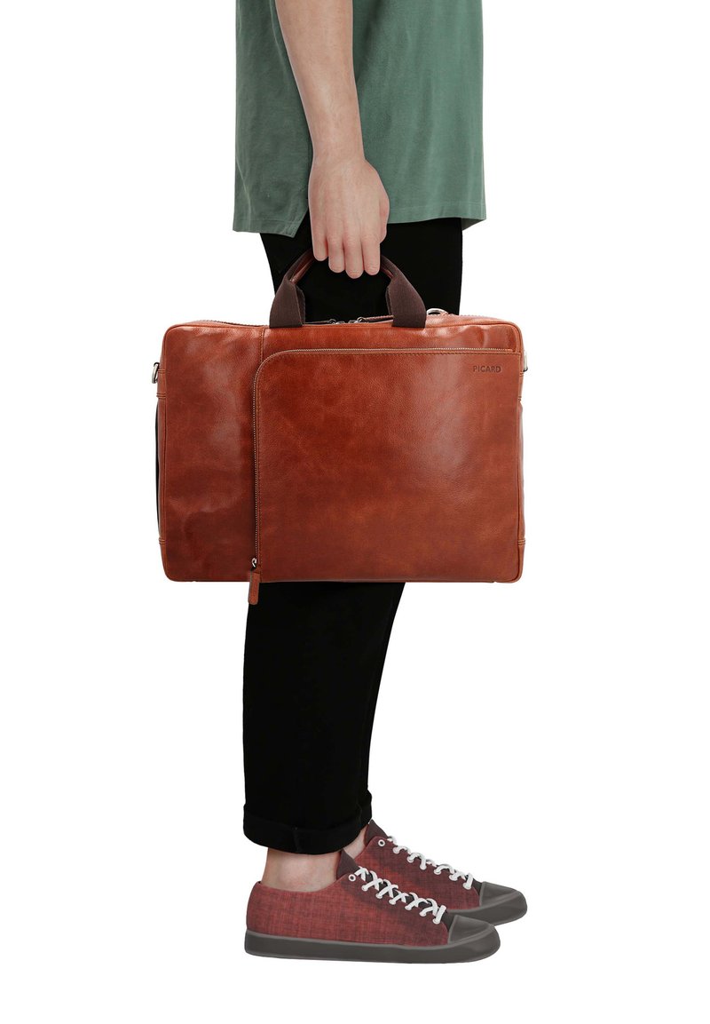 Person in legerer Kleidung hält eine braune Lederaktentasche an den Griffen und steht vor weißem Hintergrund.