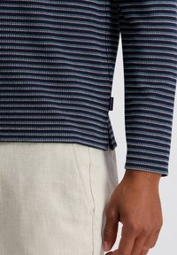 Ein Mann trägt ein navyblau-weiß gestreiftes Polohemd mit langen Ärmeln und hellbeige Hosen und steht vor einem schlichten hellen Hintergrund.