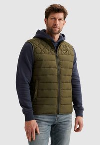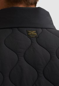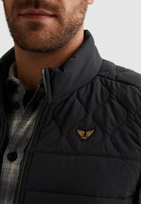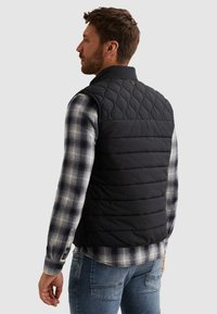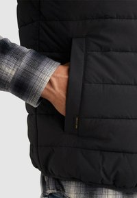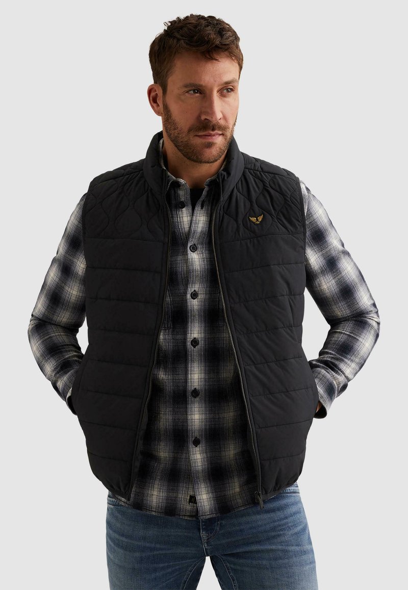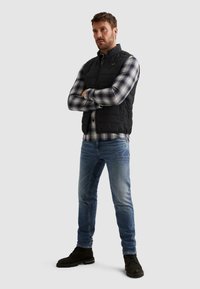 Mann trägt schwarze gesteppte Weste über schwarz-weiß kariertem Hemd, blaue Jeans, Hände in den Westentaschen, blickt zur Seite.
