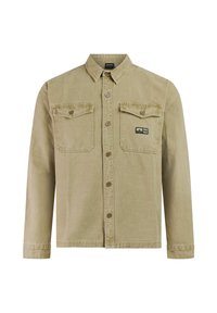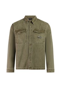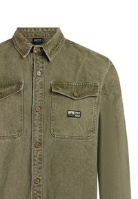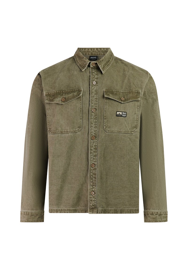 Olivgrünes langärmeliges Hemd mit Knopfleiste, zwei aufgesetzten Brusttaschen mit Klappen und kleinem "PROTEST"-Logopatch auf der rechten Tasche.