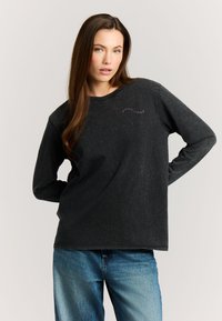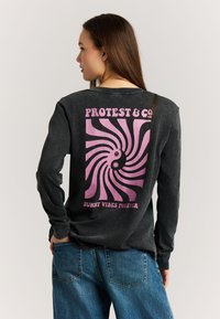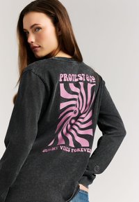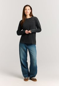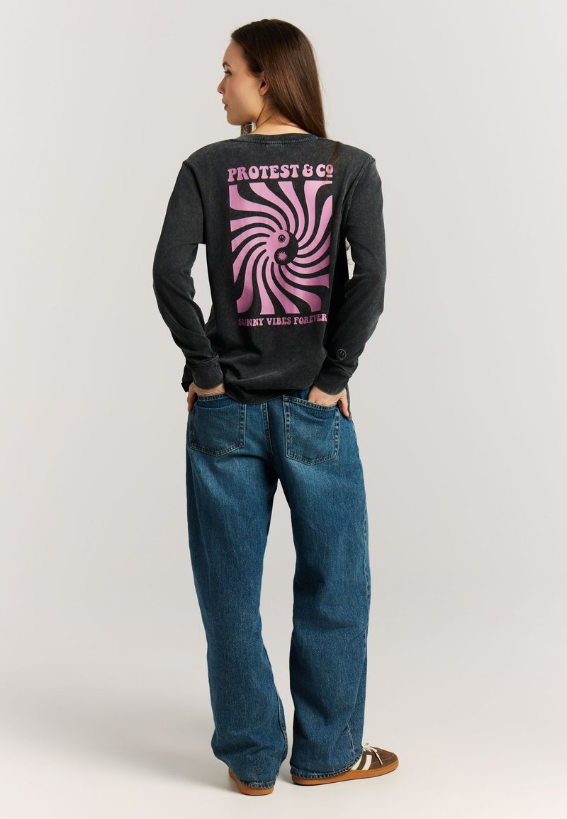Frau trägt ein schwarzes Langarmshirt mit einem pinken, wirbelnden Design und Text, kombiniert mit lockeren blauen Jeans und braunen Sneakers, steht mit den Händen in den Taschen.