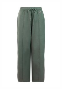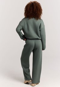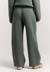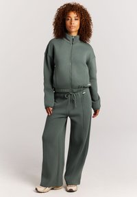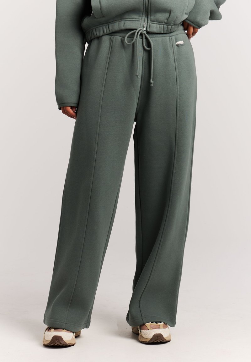 Frau trägt lockere dunkelgrüne Jogginghose mit Kordelzug in der Taille und beige Sneaker, steht vor einem schlichten hellen Hintergrund.