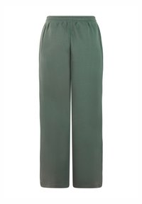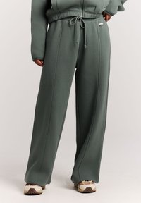 Grüne, lässig geschnittene Jogginghosen aus weichem Stoff, mit elastischem Bund und Bündchen an den Knöcheln, kombiniert mit weißen Sneakers.