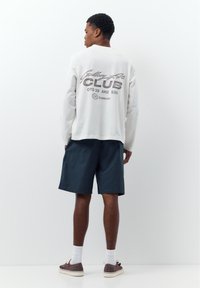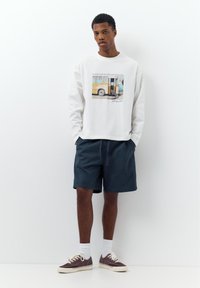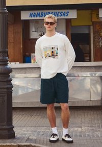 Mann trägt marineblaue Shorts mit Kordelzug, weißes Langarmshirt mit Grafik, weiße Socken und braune Sneaker mit niedrigem Schaft.