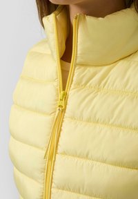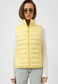 Gelbe Steppweste mit hohem Kragen, horizontaler Steppung, Reißverschluss und zwei seitlichen Taschen, kombiniert mit einem weißen Langarmshirt.