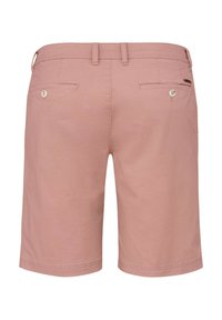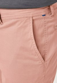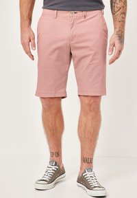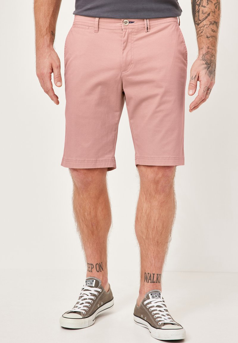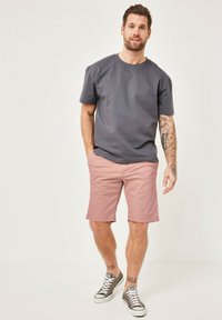 Helle rosa Baumwollshorts mit seitlichen Taschen und geradem Saum. Kombiniert mit grauen Segeltuchschuhen mit weißen Schnürsenkeln und Gummisohlen.