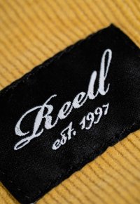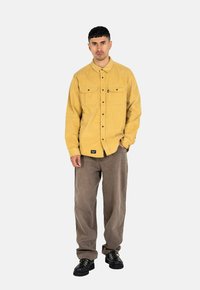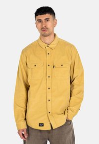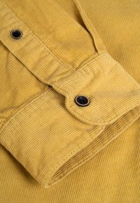 Gelbes Cordhemd mit einem Button-Down-Kragen, zwei Fronttaschen und schwarzen Knöpfen. Es hat ein Etikett in der unteren linken Ecke.