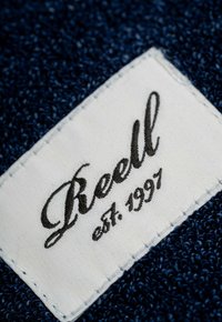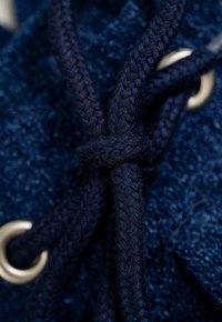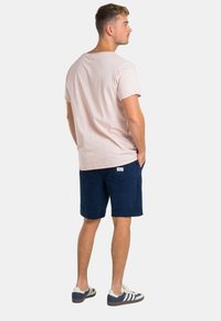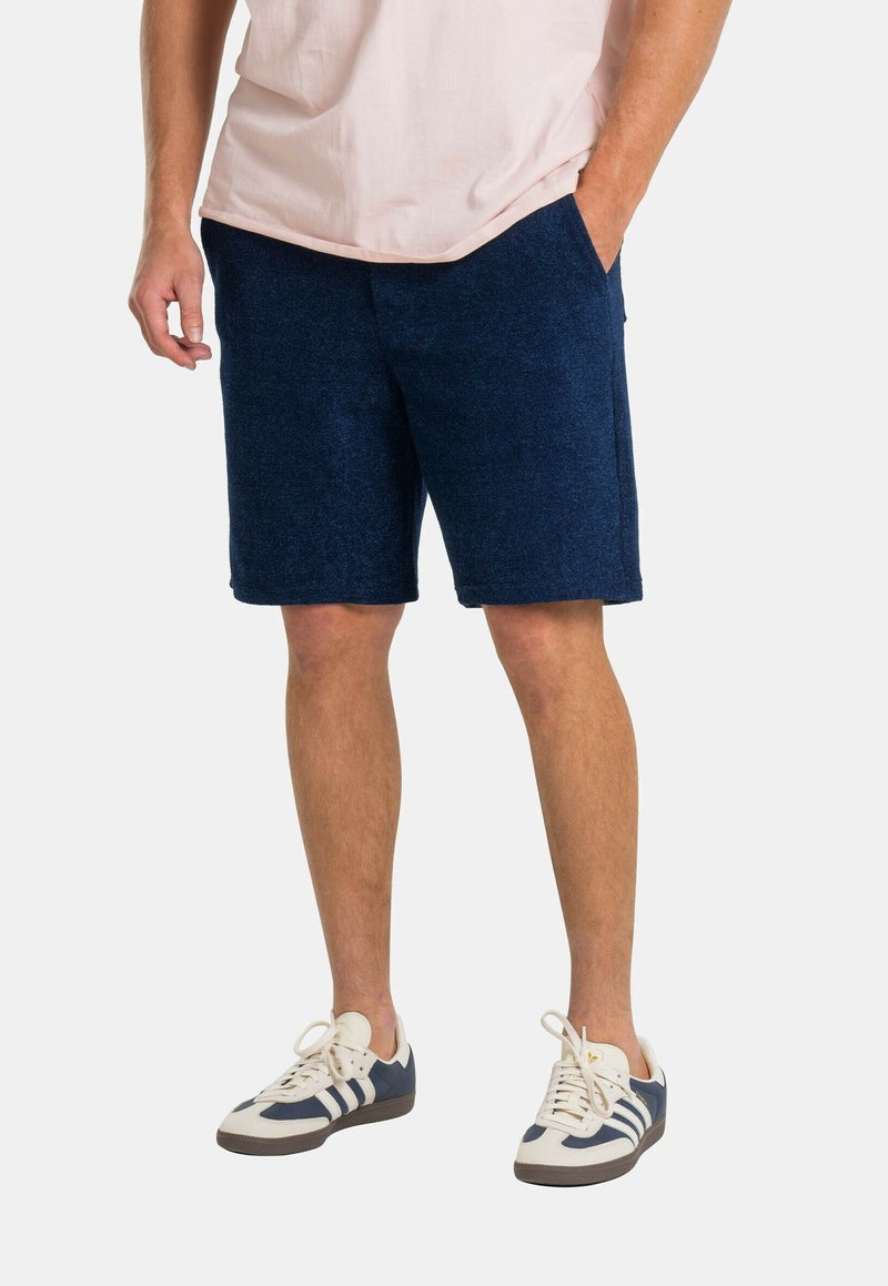 Marineblaue, weichtexturierte Shorts mit Seitentaschen und lockerer Passform, kombiniert mit hellen Sportschuhen.
