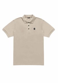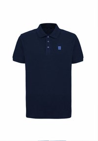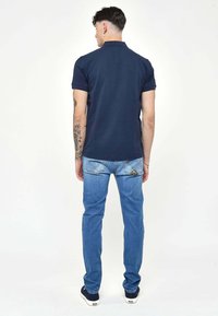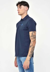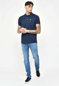 Junger Mann mit Tätowierungen am rechten Arm, der ein dunkelblaues Poloshirt und hellblaue Jeans trägt und vor weißem Hintergrund steht.