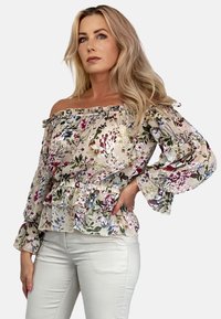 Blütenbluse mit schulterfreien Ärmeln und Rüschendetails, mit beigem Hintergrund und mehrfarbigem Blumenmuster, tailliert.