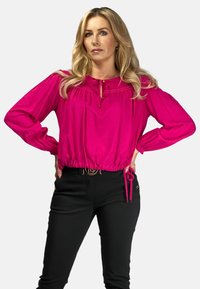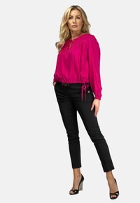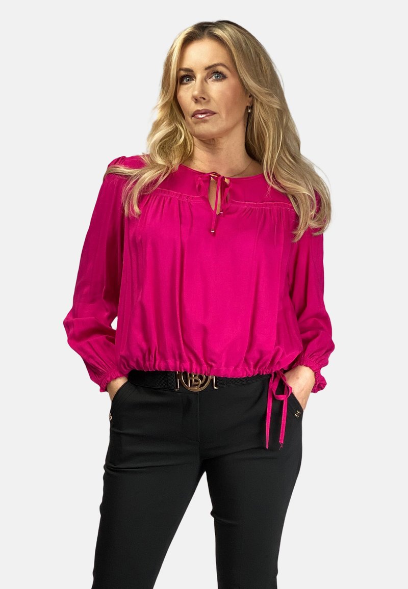 Fuchsia Bluse mit gerafftem Saum und weicher Textur, mit langen Ärmeln und einem Bindeband am Ausschnitt, kombiniert mit schwarzen Hosen und einem dekorativen Gürtel.