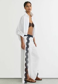 Weißes übergroßes Hemd, braunes Bikini-Oberteil, weiße Leinenhose mit schwarzer, gewellter Spitzenverzierung und braune Sandalen. Minimalistisches Design.