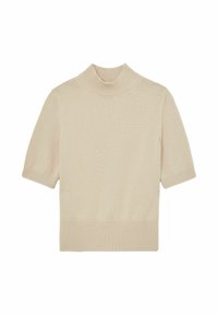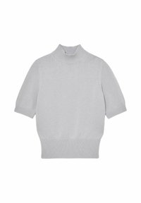 Schwarzer Pullover mit kurzen Ärmeln und hohem Kragen, mit gerippten Bündchen und Saum. Weiches Strickmaterial mit glatter Textur. Kombiniert mit schwarzen Hosen.