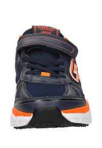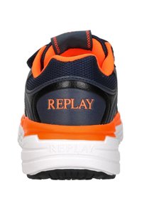 Marineblaue und orangefarbene Sportschuh mit weißer Sohle, Klettverschluss, Mesh-Einsätzen und „Replay“-Logo an der Seite und Ferse.