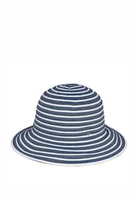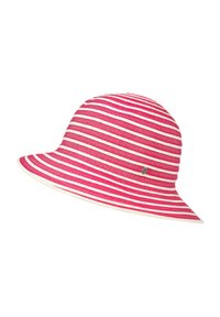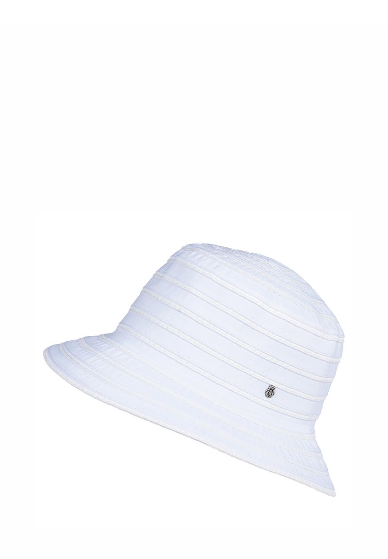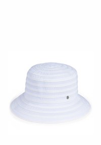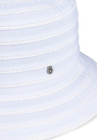 Weißer Bucket Hat mit horizontalen Nähten, einem breiten Rand und einem kleinen metallischen Logoakzent an der Seite. Hergestellt aus Baumwollmaterial.