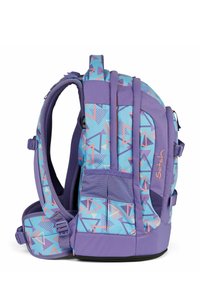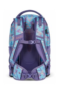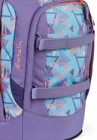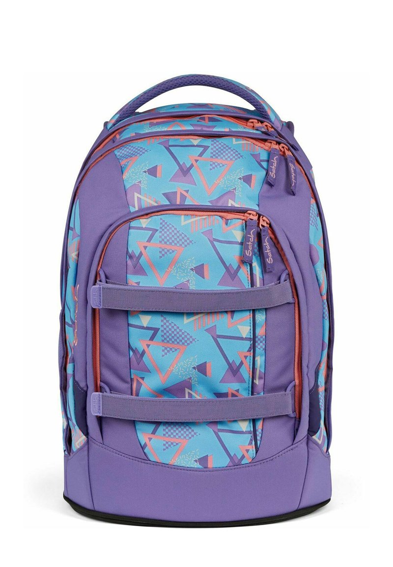 Lila Rucksack mit einem geometrischen blauen Muster, der mehrere Fächer, orangefarbene Reißverschlussakzente und verstellbare gepolsterte Träger aufweist.