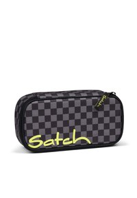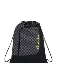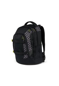 Schwarzer Rucksack mit Schachbrettmuster, verstellbaren Trägern, Fronttaschen und grünen Akzenten. Trägt man über blauen Jeans und Sneakers.