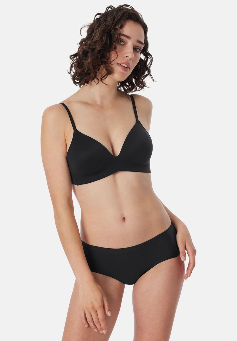Frau mit lockigem braunem Haar, die einen schwarzen BH und passende schwarze Unterwäsche trägt, steht mit entspannter Pose auf weißem Hintergrund.