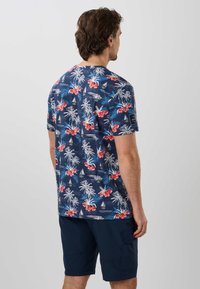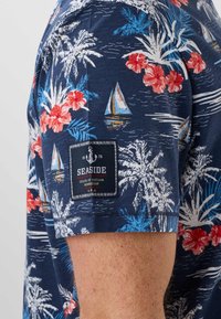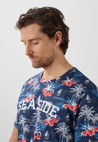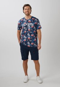 Lächelnder Mann, der ein blaues tropisches Blumen-T-Shirt mit dem Schriftzug „SEASIDE“ und marineblaue Shorts vor einem schlichten hellen Hintergrund trägt.