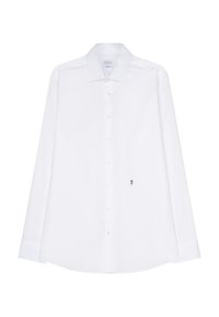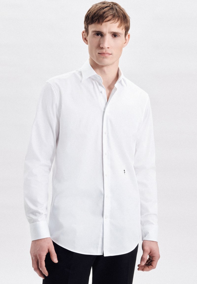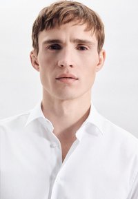 Junger Mann trägt ein weißes, schmal geschnittenes Hemd mit langen Ärmeln und schwarzen Hosen, steht vor einem einfarbigen hellen Hintergrund.