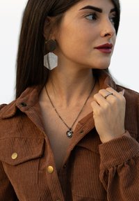 Braune Cordjacke mit Knopfdetails, über einem weißen Spitzentop geschichtet. Eine silberne Herz-Halskette, große sechseckige Ohrringe und Ringe sind sichtbar.