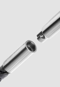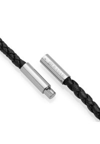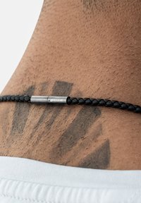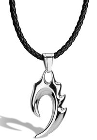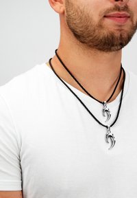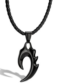 Schwarze geflochtene Halskette mit einem silberfarbenen Anhänger in Form einer stilisierten Klaue, entworfen für einen engen Sitz um den Hals.
