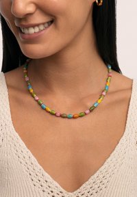 Die vergoldete Stahlkette Tarifa ist ein mehrfarbiger Maxi-Perlenanhänger mit gestreifter Struktur und goldfarbenem Ringverschluss. Diese Halskette in natürlichen Farbtönen ist perfekt für den Sommer.
