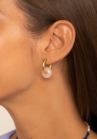 Die sommerlichsten Creolen von Singularu. Diese großen, mit 18-karätigem Gold plattierten Creolen mit ihrem Rosenquarzstein eignen sich ideal zum Tragen in diesem Sommer.